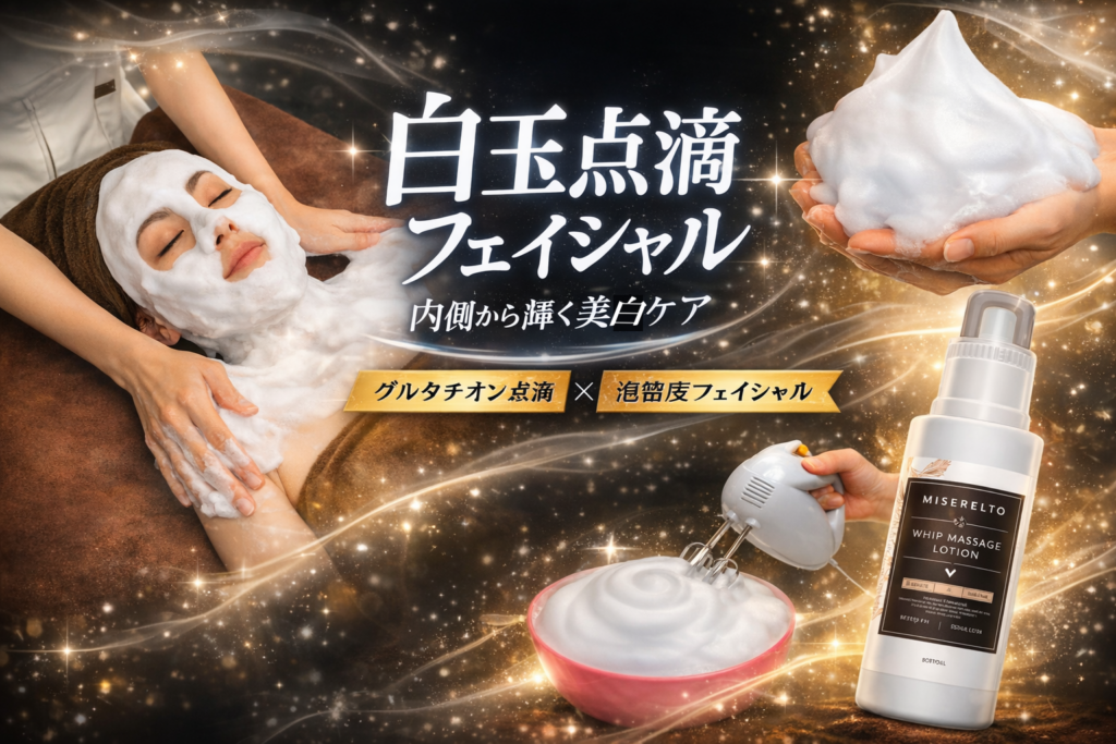 この凄い技術のマッサージを、通常であればマッサージクリームで行うところ、グルタチオン美容液のホイップクリームでマッサージします。