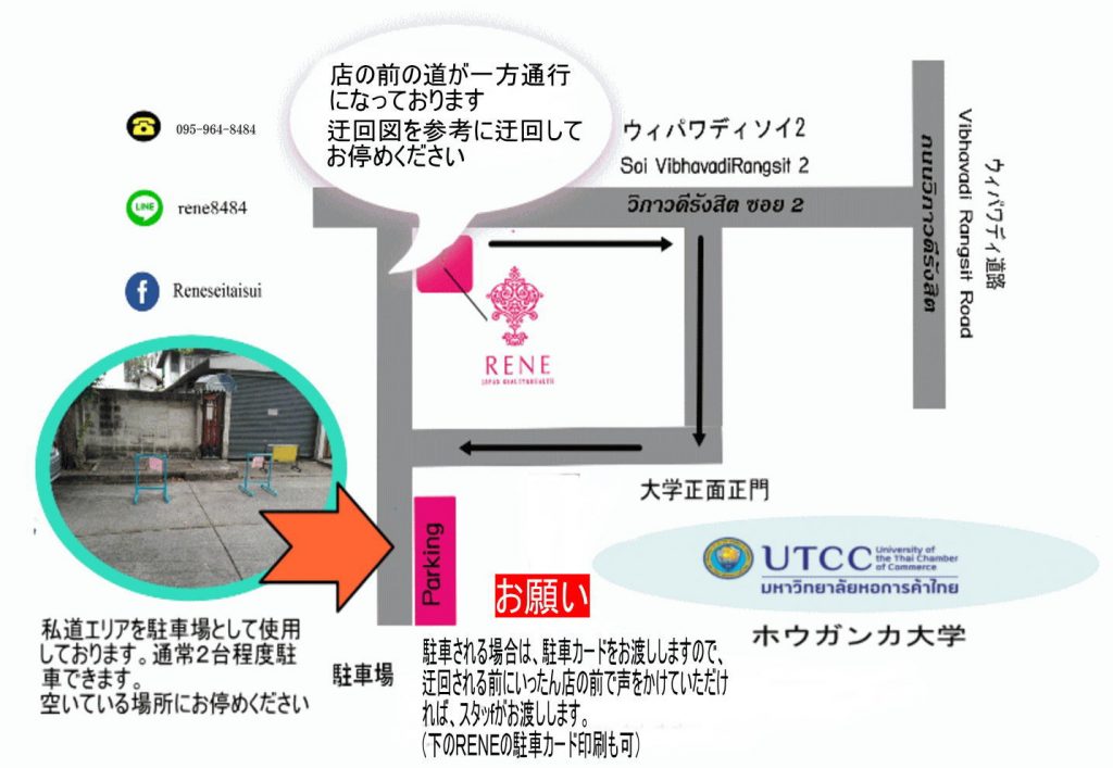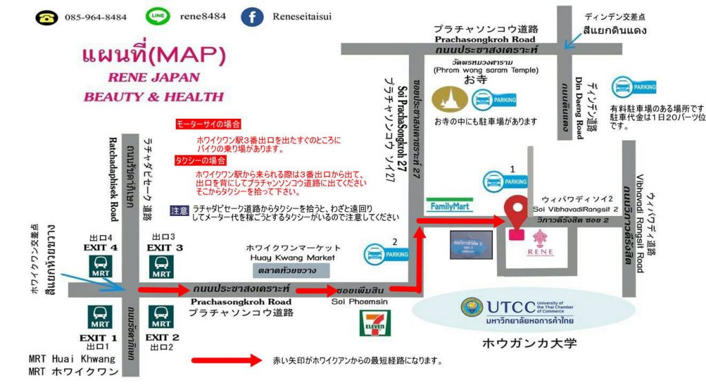スクンビットエリアからくる場合は、MRTスクンビット(BTSアソークを出て、そのまま階段を地下に下りてください)から乗車していただくと4つ目の駅になります。スクンビットからは乗車時間は概ね20分です。MRTホワイクアン駅から、RENEスパまでは下のGoogleマップを参考にしてください。(ホワイクアン駅とRENEスパの位置は赤印です)