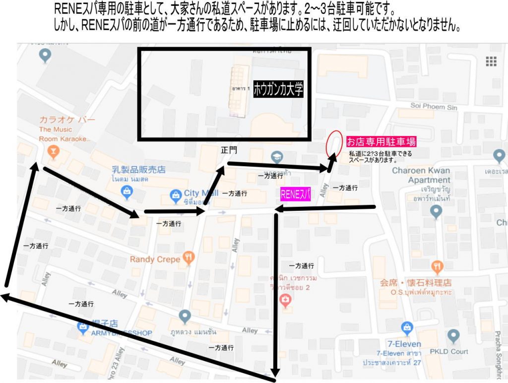 ラチャダピセーク道路からガネーシャ象神前交差点(MRT Huaikhwang駅交差点)を西方に入りプラチャソンコン通りに入ってください。同通りを1km程まっすぐ走行すると大学の裏門に突き当たりますので(右手にセブンイレブン)、大学の敷地道路には入らないように気をつけていただき右折してください。1つ目のファミリーマート前の三叉路を右折すればすぐ右手にピンク色の店舗があります。(上の周辺地図参照してください)