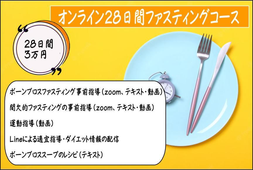 ※ ボーンブロスファスティングコースを受けていただいた方で、続けて28日間間欠的ファスティングもやりたい方は、当店のいずれかの施術を受けていただける方のみ、無料で指導を行っております。ご希望の方はヘルスコーチの店長トヨにその旨をお伝えください。店頭での指導になります。オンラインでの指導は行っておりません。